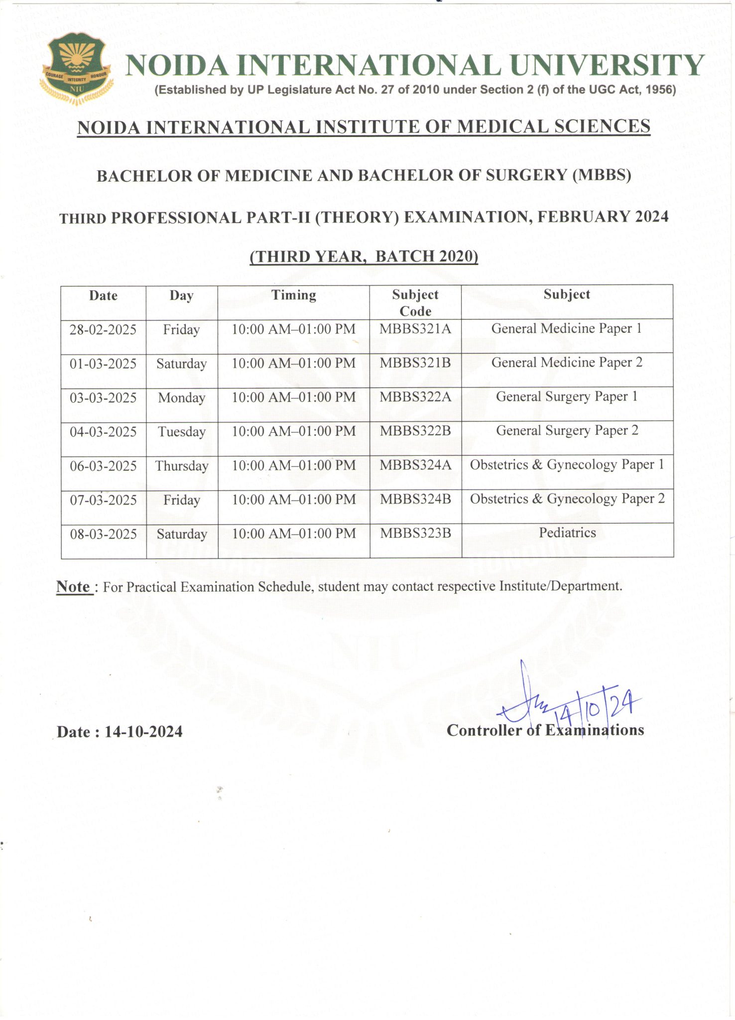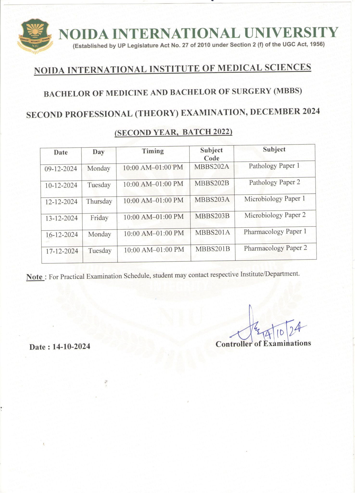 | Exam Date Sheet First Professional (Theory) Examination, August 2024 (MBBS Batch 2023), NIIMS | 17-10-2024 |